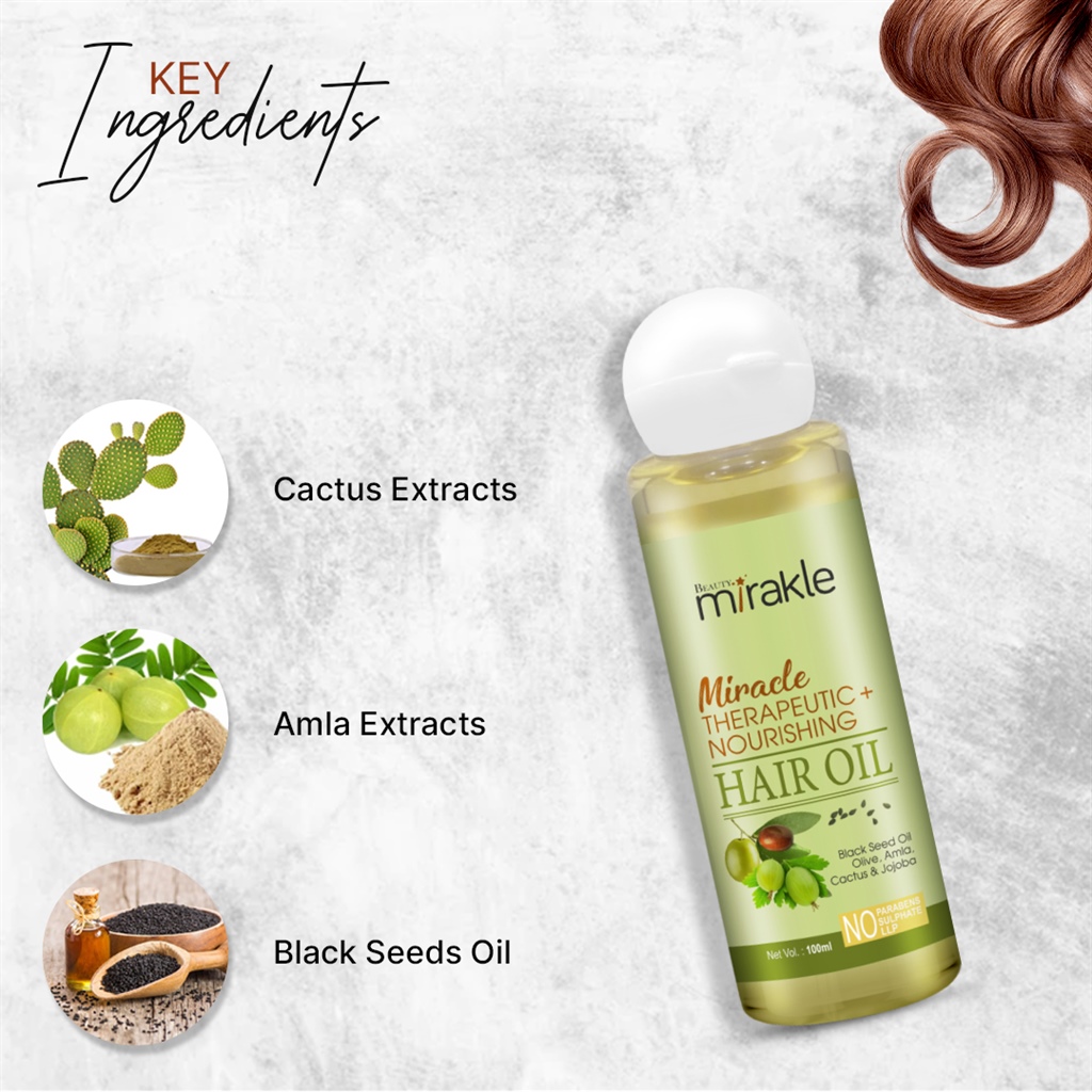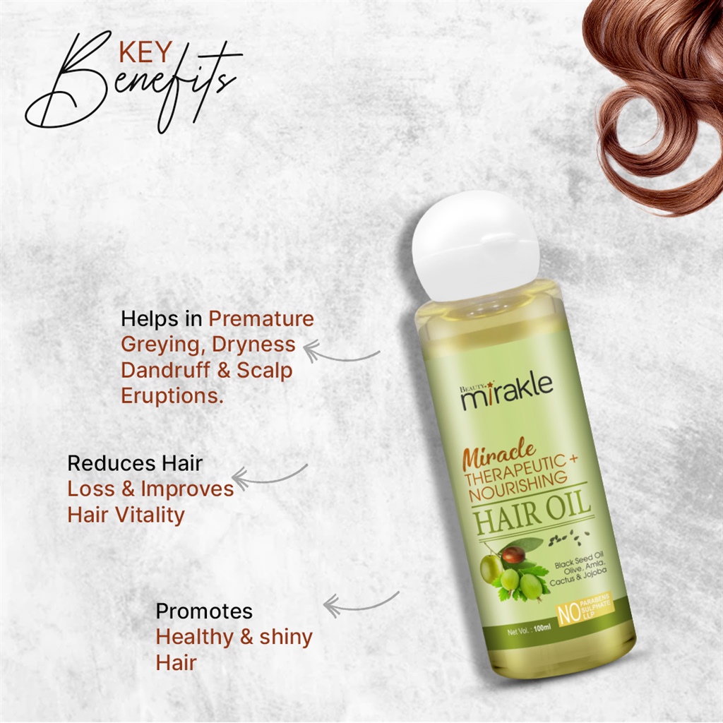Beauty Mirakle Miracle Therapeutic + Nourishing Hair Oil helps bring silkiness and strength to tresses,