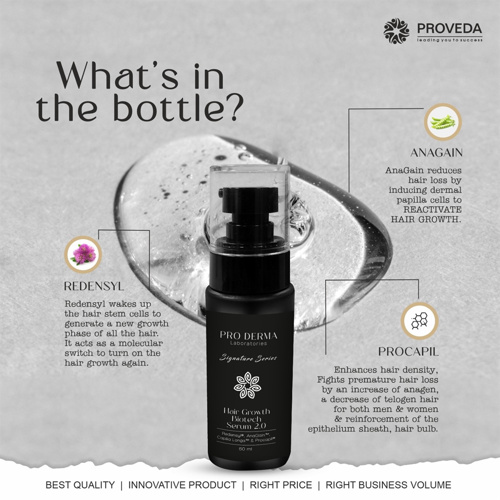 Pro Derma Hair Growth Biotech Serum 2.0 is formulated with award-winning ingredients - Redensyl®, AnaGain™, Capilia Longa™ and revolutionary Procapil® to reactivate hair stem cells for better hair growth, fuller & denser hair. Fight hair loss, maintain hair & scalp health with this game-changer of serum, and be mesmerized with the results.