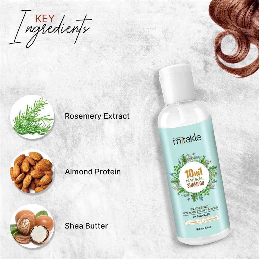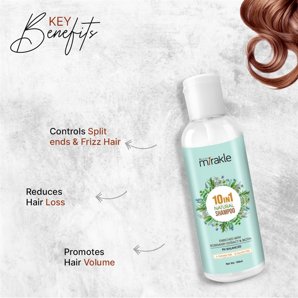 Beauty Mirakle 10in1 Natural Shampoo is a premium sulphate-free & paraben-free shampoo that delivers 10 hair benefits including adding healthy volume to your hair. Enriched with rosemary extract, biotin and several nourishing bioactives. It fight against dullness, dryness, hair fall, split ends & frizz hair.