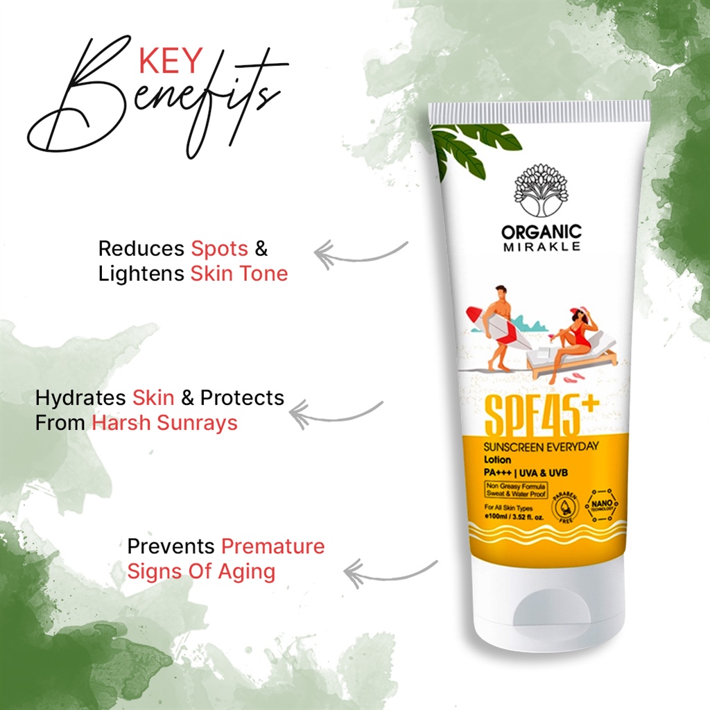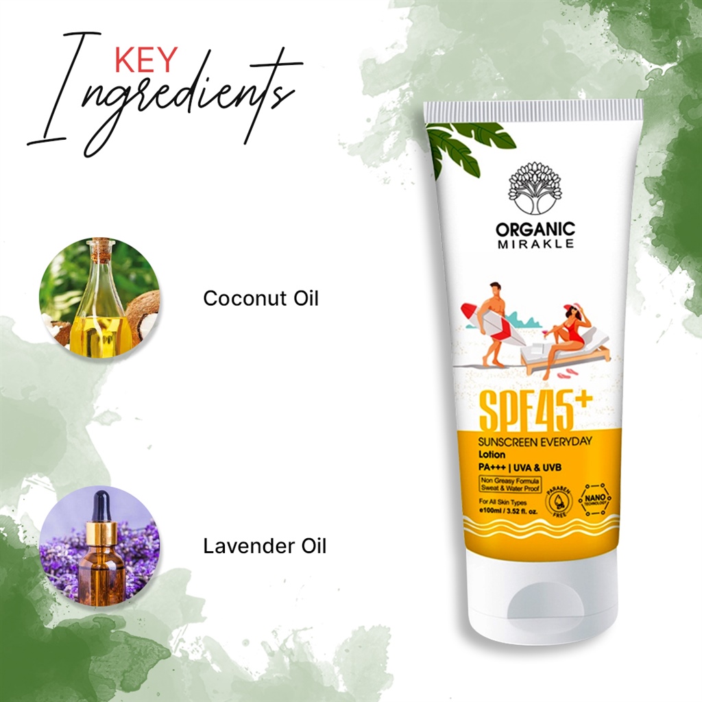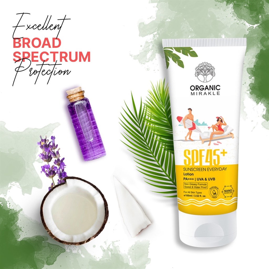 Organic Mirakle SPF45+ Sunscreen Everyday Lotion is daily sunscreen lotion for face and body that provides excellent broad spectrum protection from both UVA and UVB rays with uncoated zinc oxide, Organic Coconut Oil & Lavender contains antioxidant & soothing effect that helps to protect your skin from sun damage and signs of early aging. This unique formula has some essential oils & extracts which provides deep cleansing to remove dead skin cells & uncover natural smooth & radiant skin.