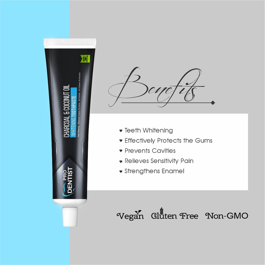Your mouth is the gatekeeper of your health and the entryway of your body. It is filed to the brim with good bacteria that support your teeth, gums and even your immune system. The artificial chemicals, detergents, and foaming agents found in many toothpaste can actually wipe out these beneficial microbes- and you need the support of these good guys to live your fullest self. Pro Dentist Probiotic Activated Charcoal Whitening Toothpaste harnesses the science backed power of activated charcoal and coconut, so you can enjoy white teeth, fresh breath and a happy smile with no regrets.