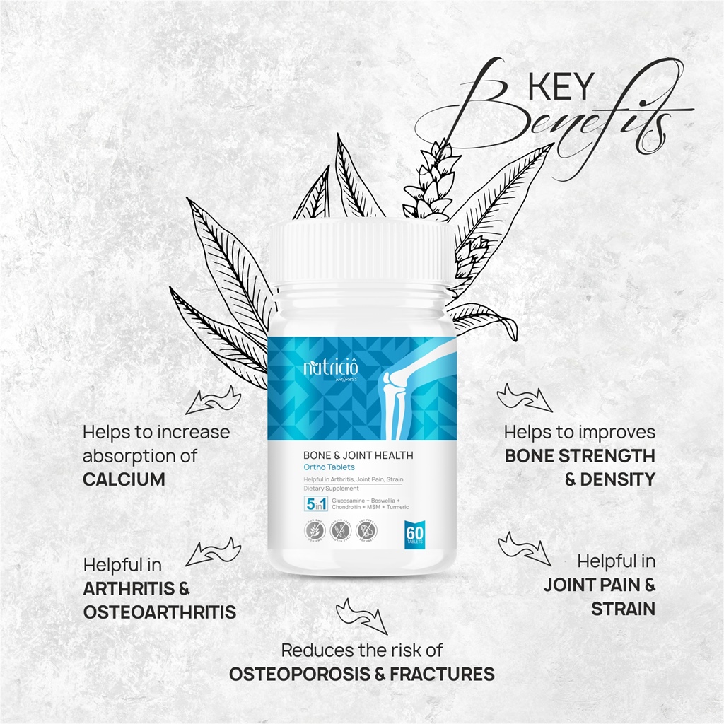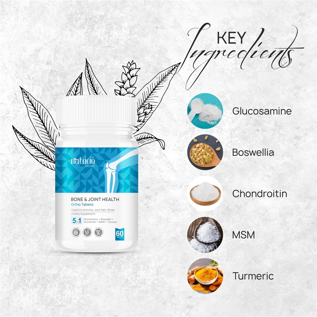 Nutricio Ortho Tablets an ideal combination of 5 compounds Glucosamine, Chondroitin, MSM, Boswellia and Turmeric to support Joint and Bone Health. Glucosamine is a compound that is naturally made in humans. The body uses glucosamine sulfate, to stimulate cells to create one of the main building blocks of joint cartilage, proteoglycans. Chondroitin sulfate attracts and holds large amounts of water to the cartilage-building proteoglycan molecules. MSM (Methyl Sulfonyl Methane) is a natural sulfur-containing molecule and efficient source of sulfur that is used by many of the body's structural molecules, including joint cartilage. Boswellia is a herbal extract from the Boswellia tree. Its anti-inflammatory effects such as rheumatoid arthritis, osteoarthritis, joint pain, swelling of the fluid-filled pads in the joints , and swelling of tendons. Turmeric and especially its most active compound curcumin is a potent anti-inflammatory and antioxidant and may also help improve symptoms of arthritis.